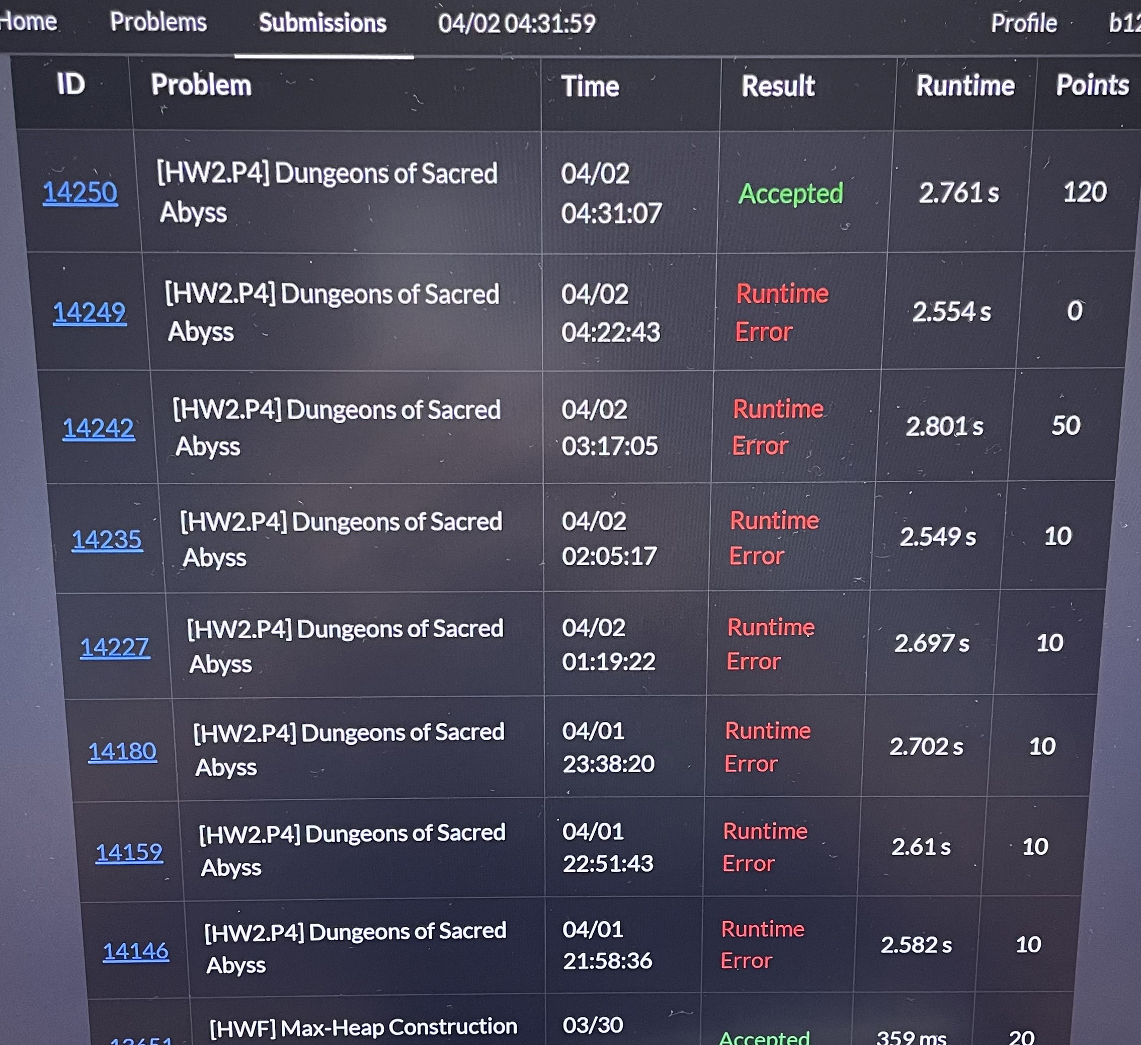 作業的話會有一半手寫一半程式,程式題以競程的角度來看其實不怎麼難,但還是會寫到很躁。因為是用 C 寫沒有 STL 可以用,所有資結都要手刻,印象中還有刻過平衡樹跟斐波那契堆,點點點每次都要寫個好幾百行。