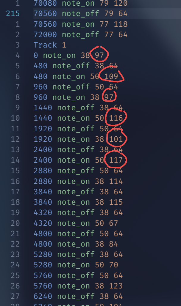 print(abs_time, msg.type, msg.note, msg.velocity)隨便滑一滑 output 就突然發現 Track 1 有些數字看起來怪怪的