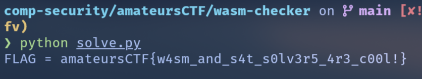 }可以看到他就是用一堆條件限制了 flag 的每個字元,可以用 z3 solver 來找到符合 的解,我寫了一個 script parse wat 檔並自動加到 z3 裡面求解: