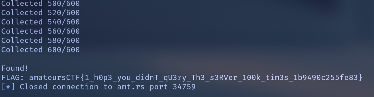 FLAG: amateursCTF{1_h0p3_you_didnT_qU3ry_Th3_s3RVer_100k_tim3s_1b9490c255fe83}